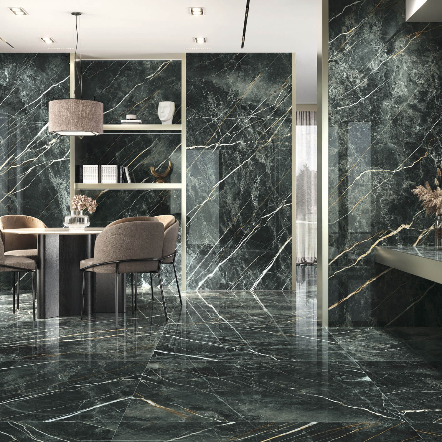 Podna pločica, jaka, ravna, visok sjaj, imitacija mermera u zelenoj boji sa zlatnim, belim i braon žilama